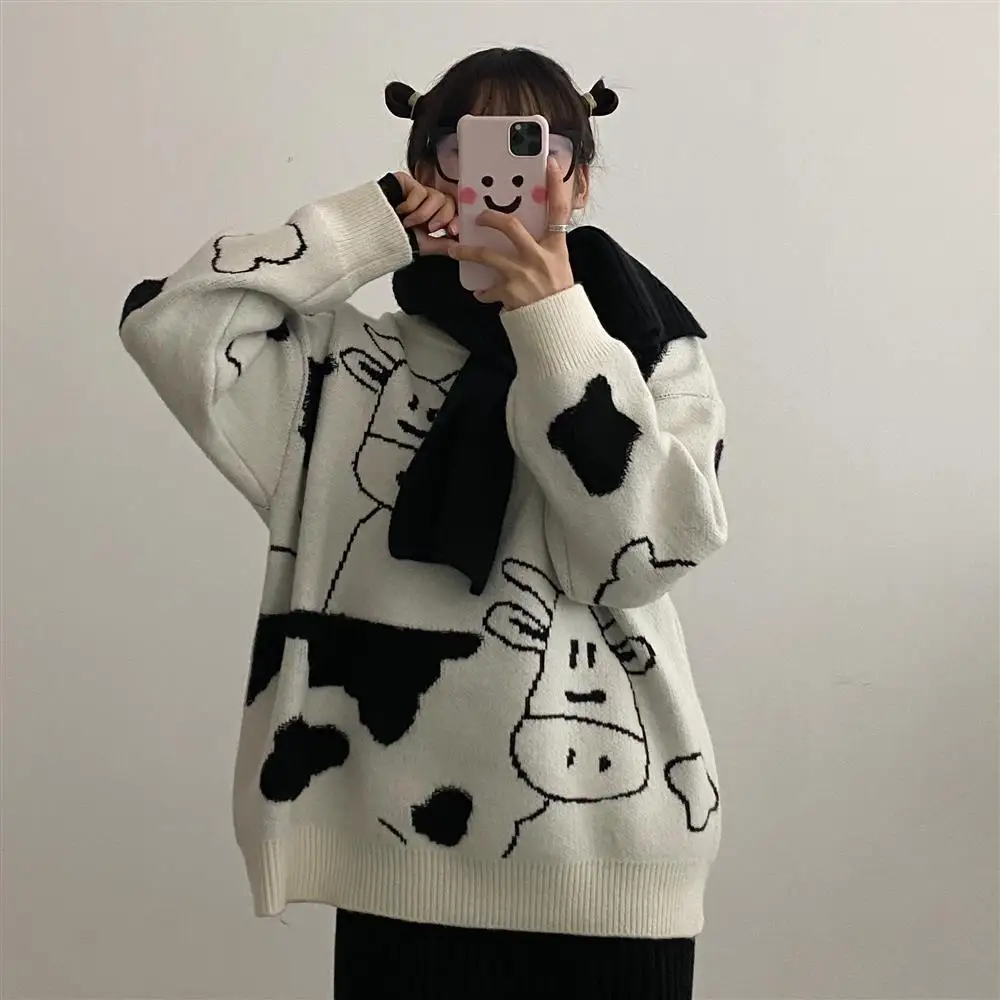 Name: Mujer suéteres Chandails Otoño Invierno vaca brocado de las mujeres, suéter de cuello redondo Jersey holgado abrigo